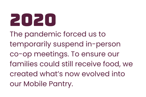 In addition to our Food Co-ops, we also have a Mobile Pantry. It began as a response to the pandemic in 2020 when co-ops couldn’t meet in person. We packed food in boxes and dedicated co-op members and volunteers delivered them.